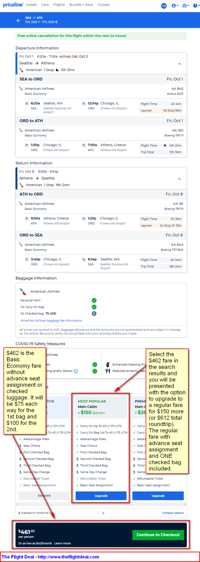 Select the $462 fare in the search results and you will be presented with the option to upgrade to a regular fare for $150 more (or $612 total roundtrip). The regular fare with advance seat assignment and ONE checked bag included.