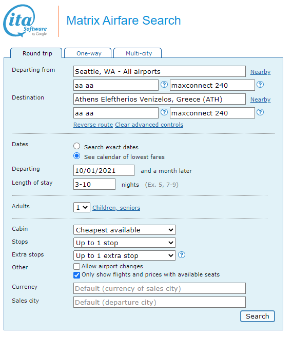 SEA – ORD (Chicago) – ATH (Athens) – ORD – SEA