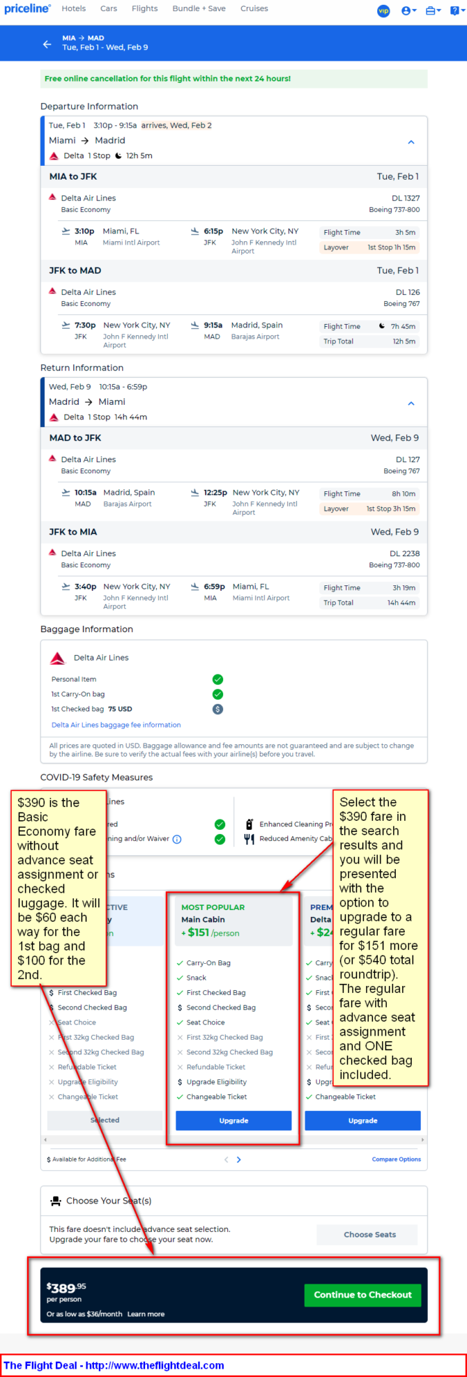 • Select the $390 fare in the search results and you will be presented with the option to upgrade to a regular fare for $151 more (or $540 total roundtrip). The regular fare with advance seat assignment and ONE checked bag included.