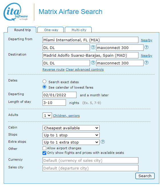 • Use ITA Software Matrix Airfare Search and use the following search criteria: