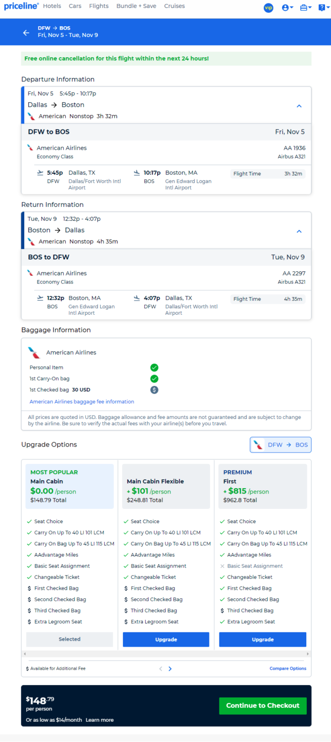 Valid for travel from late October – early November. Availability is limited. Must purchase at least 21 days in advance of departure