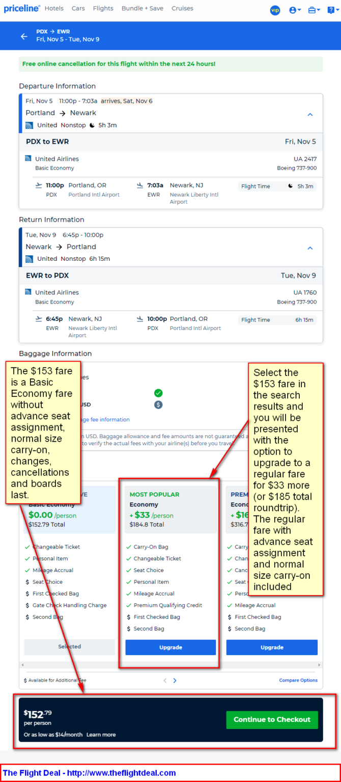 Select the $153 fare in the search results and you will be presented with the option to upgrade to a regular fare for $33 more (or $185 total roundtrip). The regular fare with advance seat assignment and normal size carry-on included