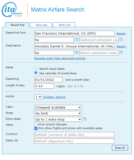 • Support us by using our Hawaiian Air link to book with dates found on ITA Software Matrix Airfare Search.
