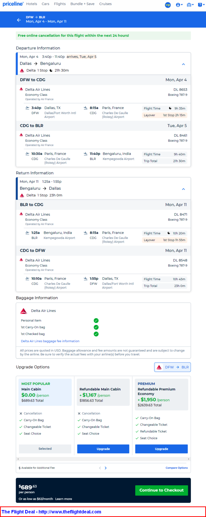 DFW – CDG (Paris) – BLR (Bangalore) – CDG – DFW