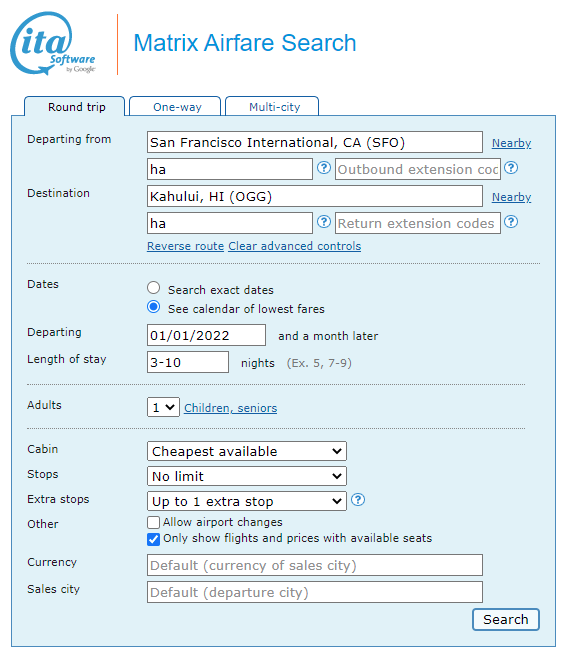 • Support us by using our Hawaiian Air link to book with dates found on ITA Software Matrix Airfare Search.
