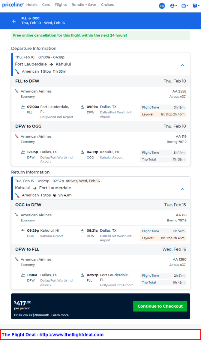 FLL – DFW (Dallas) – OGG (Maui) – DFW – FLL