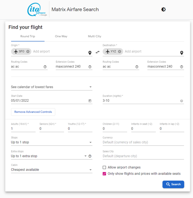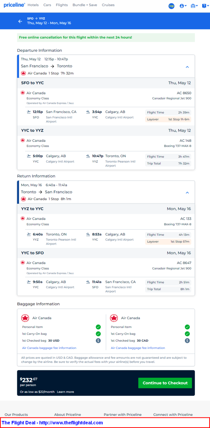 - SFO – YYC (Calgary) – YYZ (Toronto) – YYZ – SFO
