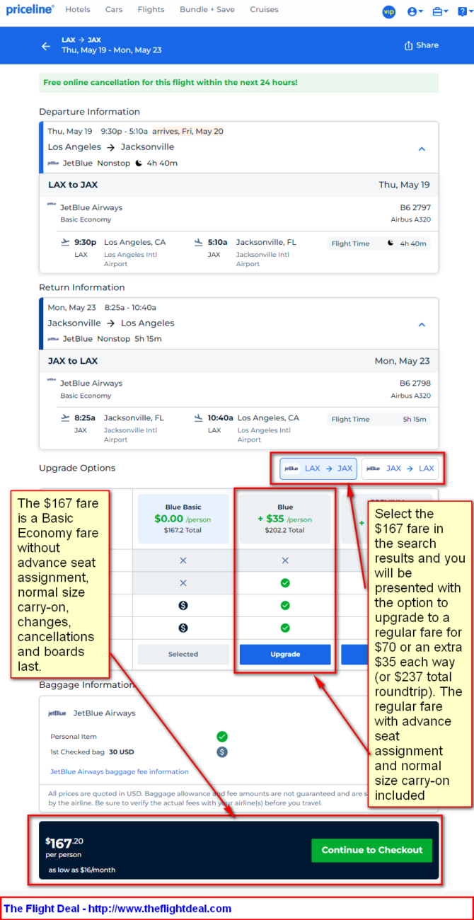 Select the $167 fare in the search results and you will be presented with the option to upgrade to a regular fare for $70 or an extra $35 each way (or $237 total roundtrip). The regular fare with advance seat assignment and normal size carry-on included