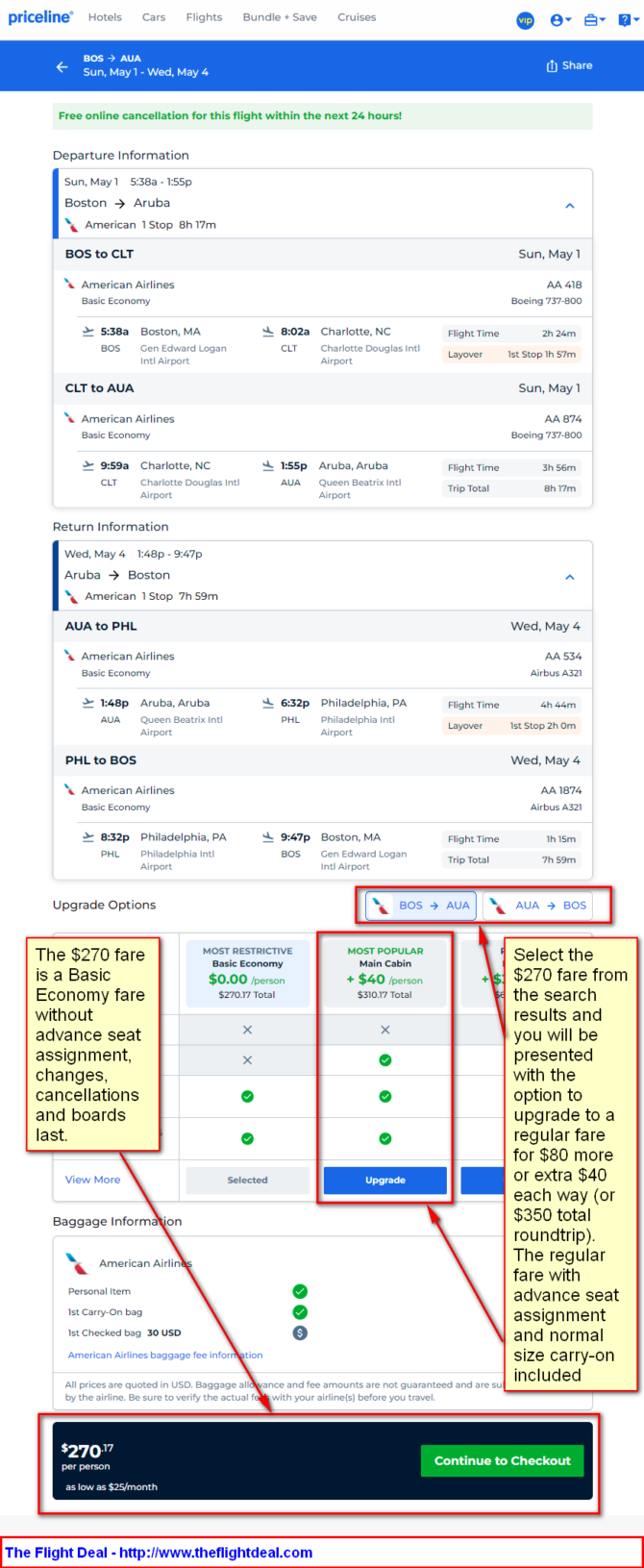 • Select the $270 fare from the search results and you will be presented with the option to upgrade to a regular fare for $80 more or extra $40 each way (or $350 total roundtrip). The regular fare with advance seat assignment and normal size carry-on included
