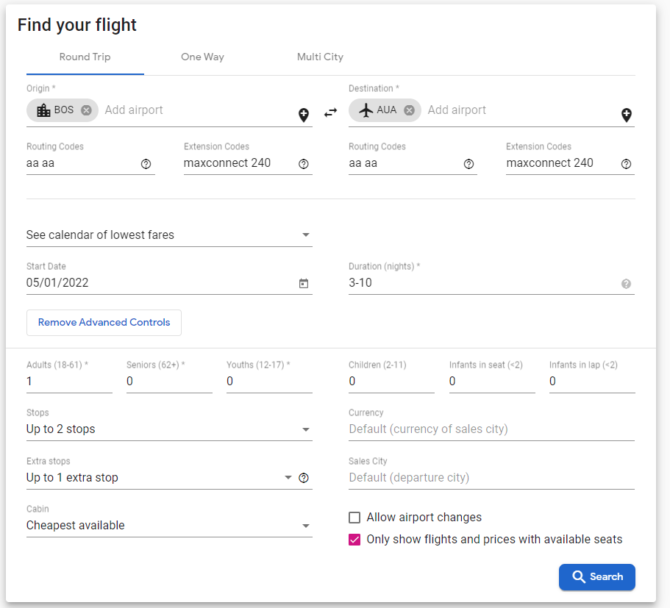 • Use ITA Software Matrix Airfare Search and use the following search criteria: