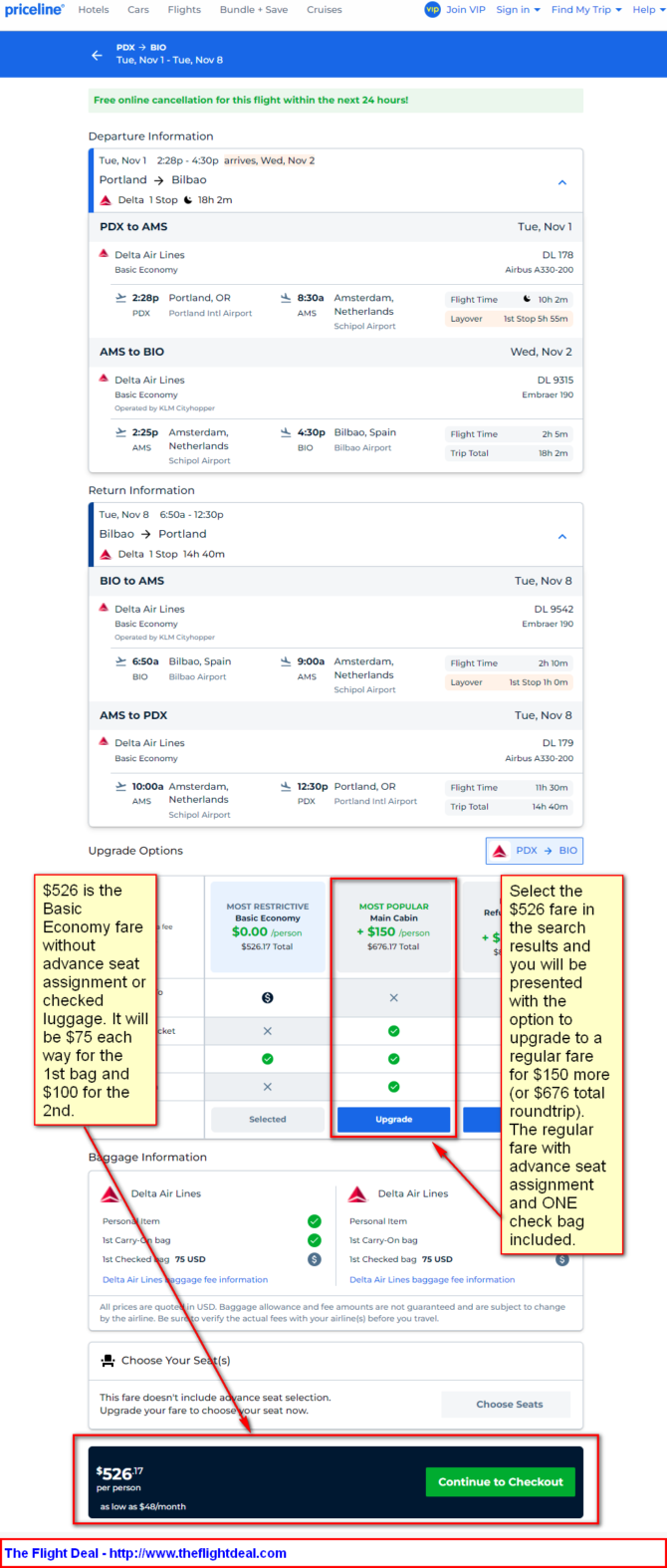 • Select the $526 fare in the search results and you will be presented with the option to upgrade to a regular fare for $150 more (or $676 total roundtrip). The regular fare with advance seat assignment and ONE check bag included.