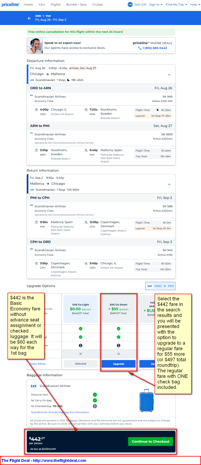 - Select the $442 fare in the search results and you will be presented with the option to upgrade to a regular fare for $55 more (or $497 total roundtrip). The regular fare with ONE check bag included.