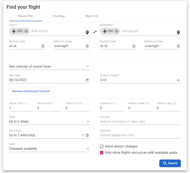 - Use ITA Software Matrix Airfare Search and use the following search criteria: