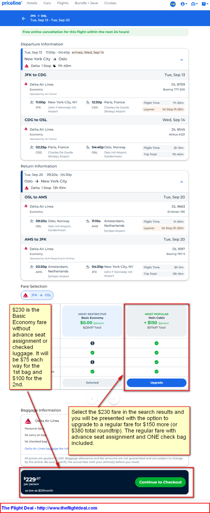 Select the $230 fare in the search results and you will be presented with the option to upgrade to a regular fare for $150 more (or $380 total roundtrip). The regular fare with advance seat assignment and ONE check bag included. .