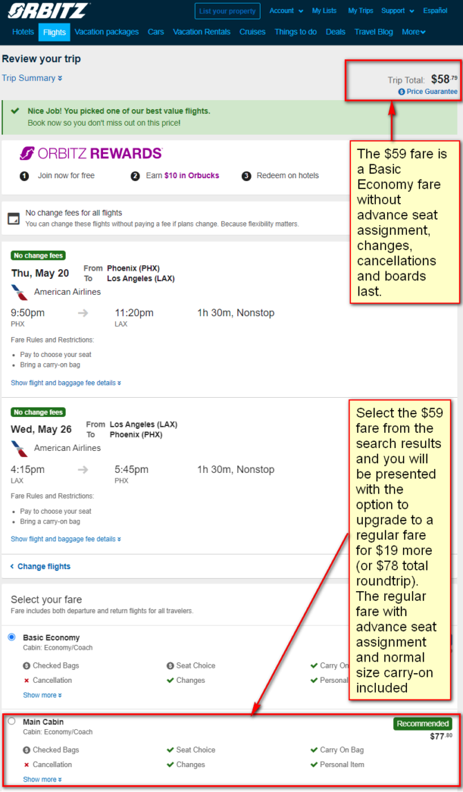 Select the $59 fare from the search results and you will be presented with the option to upgrade to a regular fare for $19 more (or $78 total roundtrip). The regular fare with advance seat assignment and normal size carry-on included