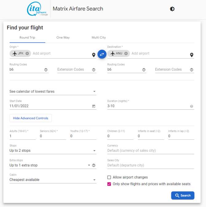 • The Matrix Airfare Search by ITA Software search page should be like below when all values are inputted