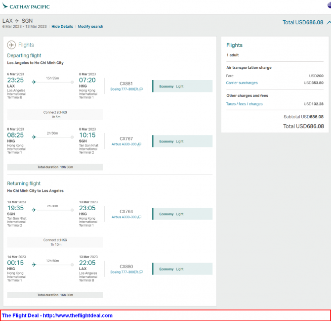 - LAX – HKG (Hong Kong) – SGN (Ho Chi Minh City) – HKG – LAX