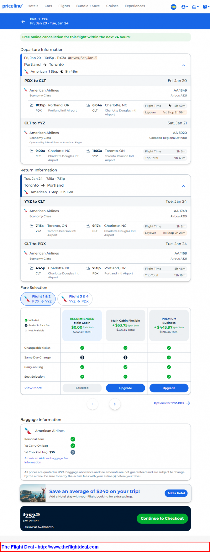PDX – CLT (Charlotte) – YYZ (Toronto) -CLT – PDX