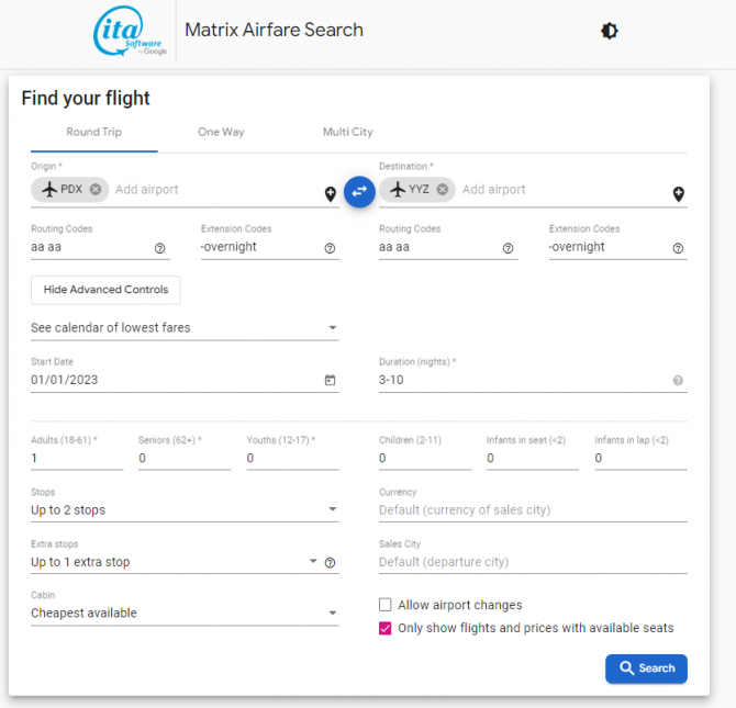 The Matrix Airfare Search by ITA Software search page should be like below when all values are inputted
