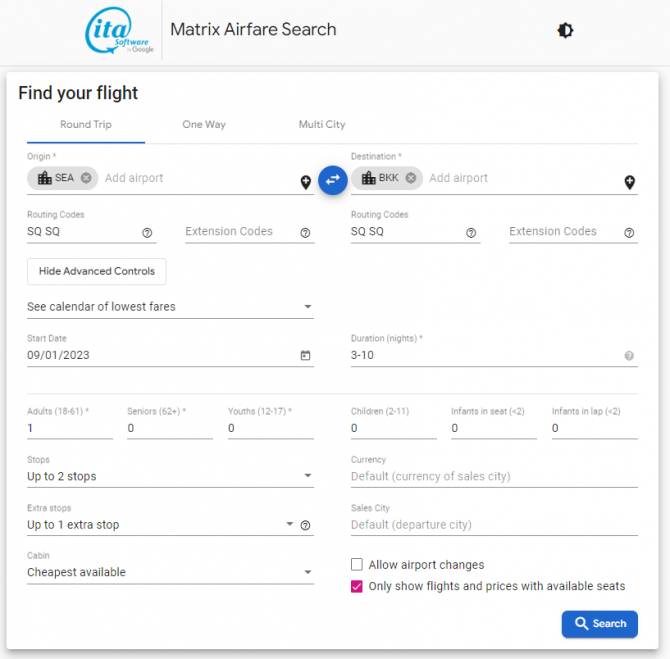 - The Matrix Airfare Search by ITA Software search page should be like below when all values are inputted