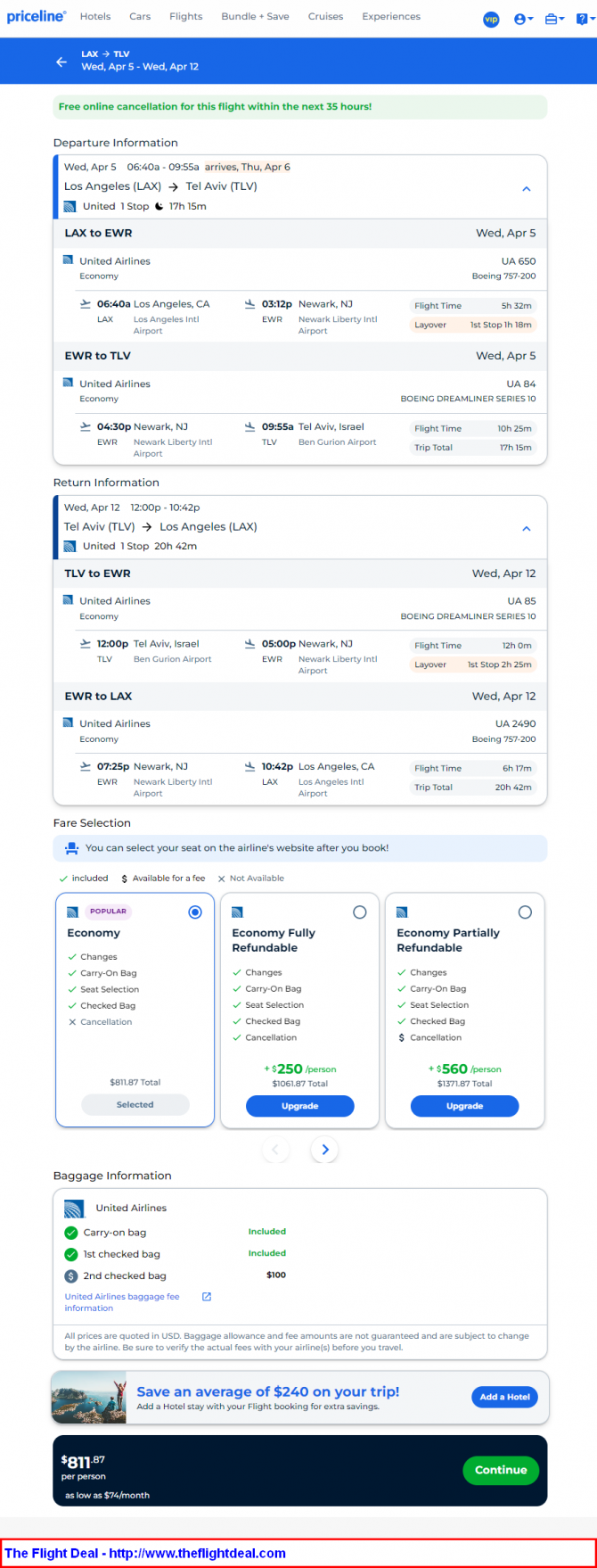 LAX – EWR (Newark) – TLV (Tel Aviv) – EWR – LAX