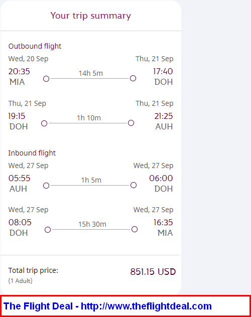 • MIA – DOH (Doha) – AUH (Abu Dhabi) – DOH – MIA