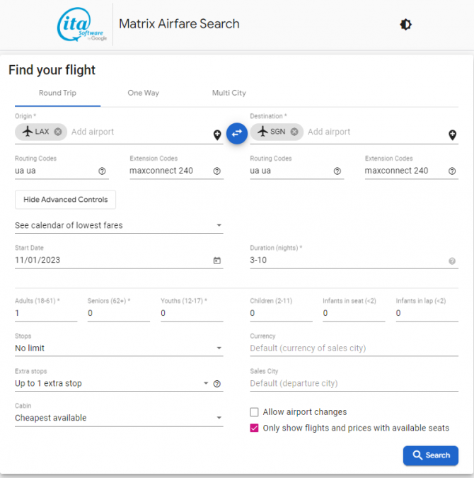 • The Matrix Airfare Search by ITA Software search page should be like below when all values are inputted