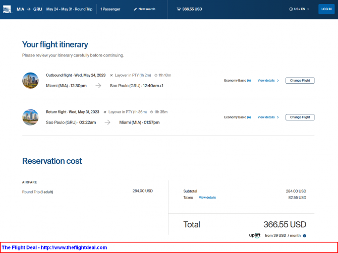 - MIA – PTY (Panama City) – GRU (Sao Paulo) – PTY – MIA