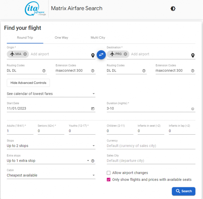 • The Matrix Airfare Search by ITA Software search page should be like below when all values are inputted