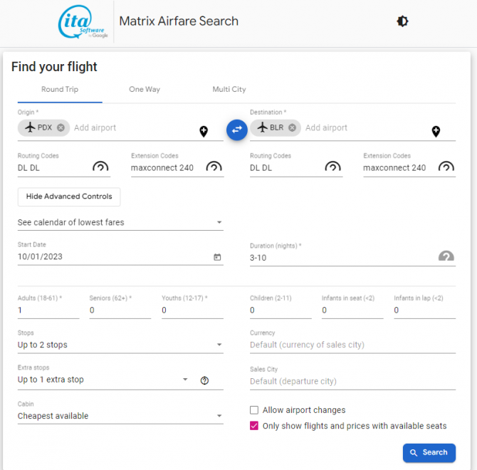 • The Matrix Airfare Search by ITA Software search page should be like below when all values are inputted