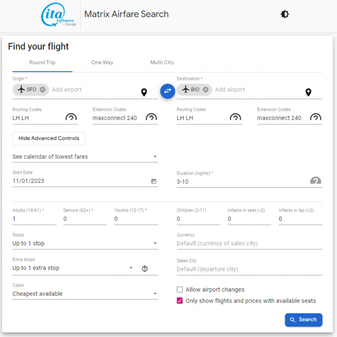 - The Matrix Airfare Search by ITA Software search page should be like below when all values are inputted