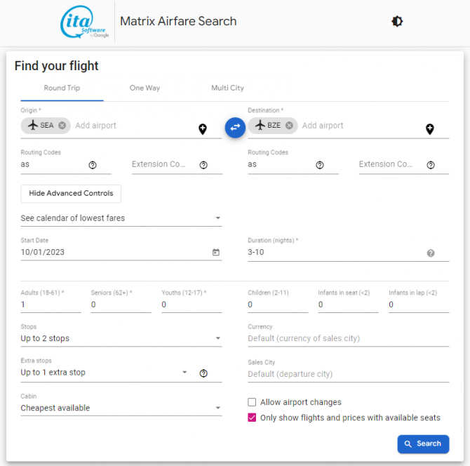 • The Matrix Airfare Search by ITA Software search page should be like below when all values are inputted