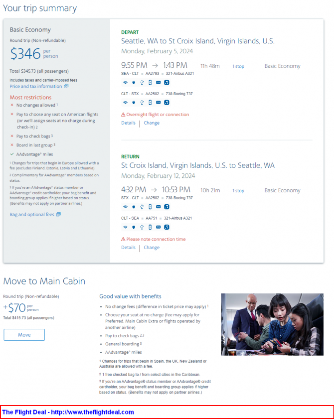 • SEA – CLT (Charlotte) – STX (St. Croix) – CLT – SEA