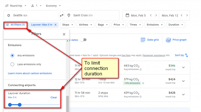 • Google Flights will show availability with overnight layovers with this fare. To show availability with layovers of no more than 5 hours, select all Filters, then scroll down to connecting airports and you will see a selector to limit connection duration like this: