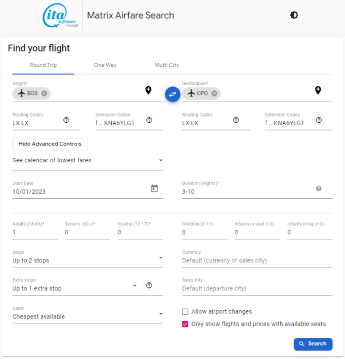 • The Matrix Airfare Search by ITA Software search page should be like below when all values are inputted