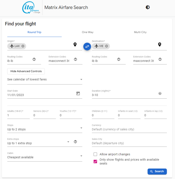 - The Matrix Airfare Search by ITA Software search page should be like below when all values are inputted