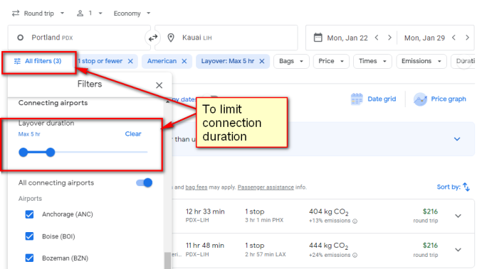 Google Flights will show availability with overnight layovers with this fare. To show availability with layovers of no more than 5 hours, select all Filters, then scroll down to connecting airports and you will see a selector to limit connection duration like this: