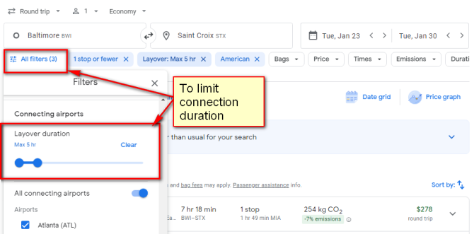 Google Flights will show availability with overnight layovers with this fare. To show availability with layovers of no more than 5 hours, select all Filters, then scroll down to connecting airports and you will see a selector to limit connection duration like this: