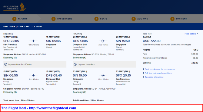 - SFO – SIN (Singapore) – DPS (Bali) – SIN – SFO