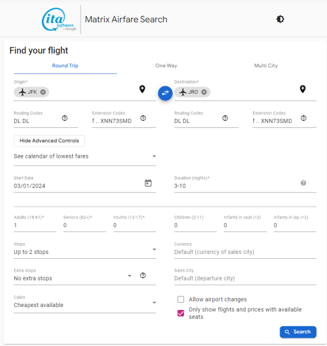 - The Matrix Airfare Search by ITA Software search page should be like below when all values are inputted
