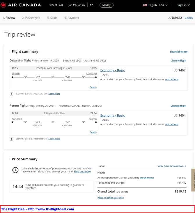 - BOS – YYZ (Toronto) – YVR (Vancouver) – AKL (Auckland) – YVR – YYZ – BOS