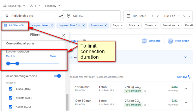 • Google Flights will show availability with overnight layovers with this fare. To show availability with layovers of no more than 5 hours, select all Filters, then scroll down to connecting airports and you will see a selector to limit connection duration like this:
