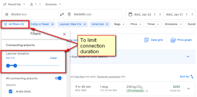 Google Flights will show availability with overnight layovers with this fare. To show availability with layovers of no more than 5 hours, select all Filters, then scroll down to connecting airports and you will see a selector to limit connection duration like this: