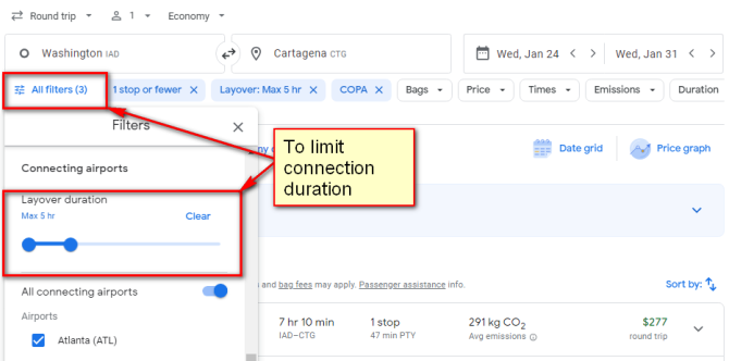• Google Flights will show availability with overnight layovers with this fare. To show availability with layovers of no more than 5 hours, select all Filters, then scroll down to connecting airports and you will see a selector to limit connection duration like this: