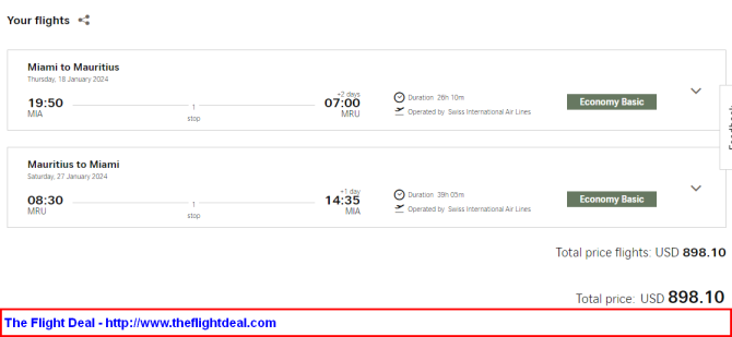 - MIA – ZRH (Zurich) – MRU (Mauritius) – ZRH – MIA