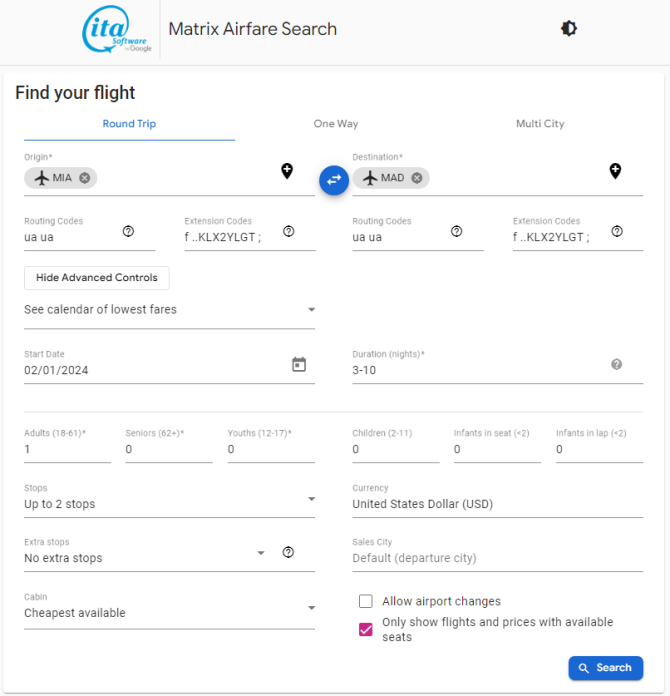 • The Matrix Airfare Search by ITA Software search page should be like below when all values are inputted