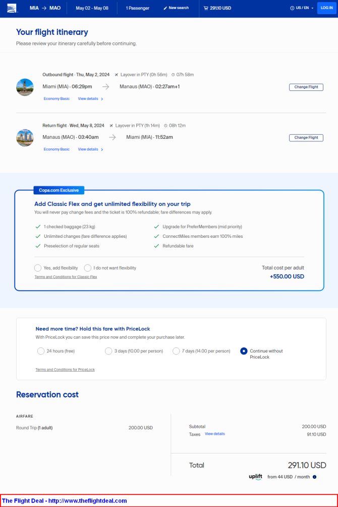 • MIA – PTY (Panama City) – MAO (Manaus) – PTY – MIA