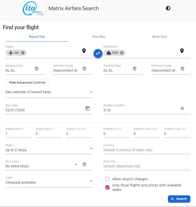 • The Matrix Airfare Search by ITA Software search page should be like below when all values are inputted