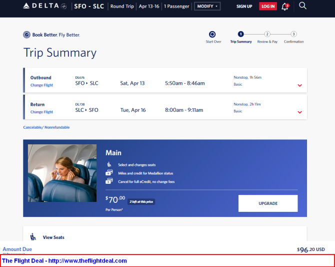 The Shorthaul – Delta: San Francisco – Salt Lake City, Utah (and vice versa). $96 (Basic Economy) / $166 (Regular Economy). Roundtrip, including all Taxes