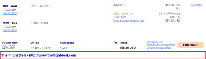 - BOS – CPH (Copenhagen) – WAW (Warsaw) – CPH – BOS
